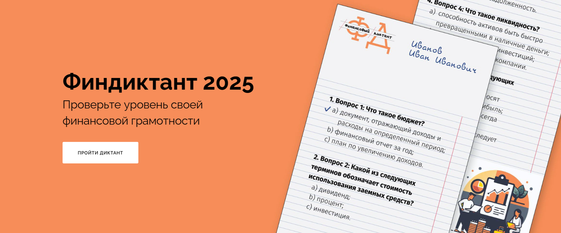 С 08 сентября по 08 октября 2025 года проходит ежегодная просветительская акция «Финансовый диктант». Вопросы финансового диктанта разделены по уровню сложности на три целевые группы: учащиеся 8-11 классов, студенты и взрослое население, а также лица пенсионного возраста. Каждый набор заданий является уникальным и формируется методом случайной выборки из общего банка вопросов. Сертификат об участии будет доступен сразу после завершения прохождения финансового диктанта и дополнительно направлен на электронную почту, указанную при заполнении регистрационной формы. В случае возникновения вопросов просьба обращаться к ответственному лицу для взаимодействия Надежде Олеговне Ерешко, 8-383-304-85-75, эл почта: findictant@ndfp.ru. Финансовый диктант проводится в формате онлайн-теста на официальном сайте: https://финдиктант.рф . Участникам необходимо ответить на 25 вопросов по ключевым тематикам финансовой грамотности – планирование бюджета, налогообложение, страхование, инвестирование, защита прав потребителей и основы финансовой безопасности. |